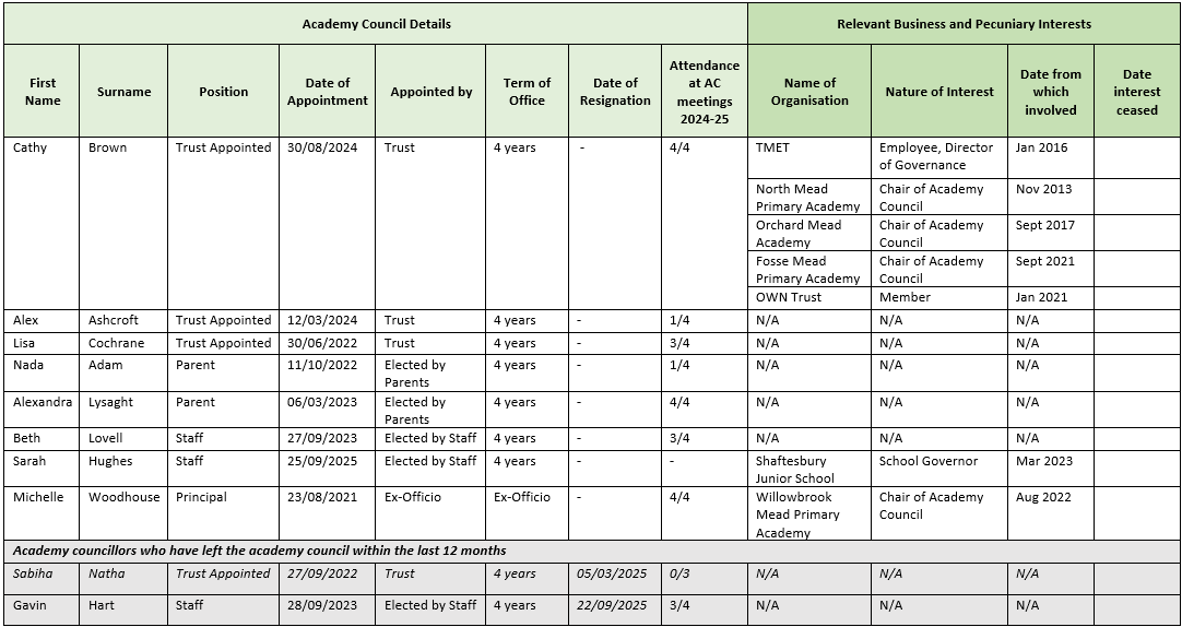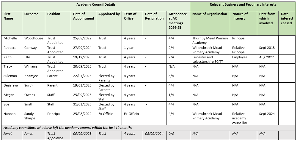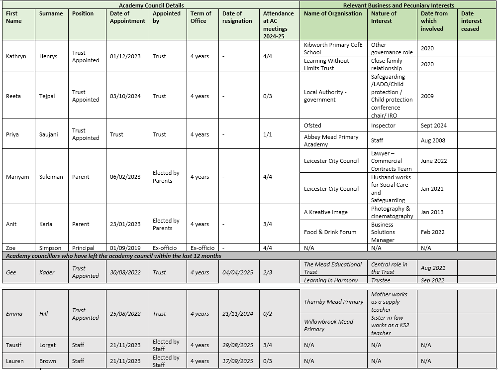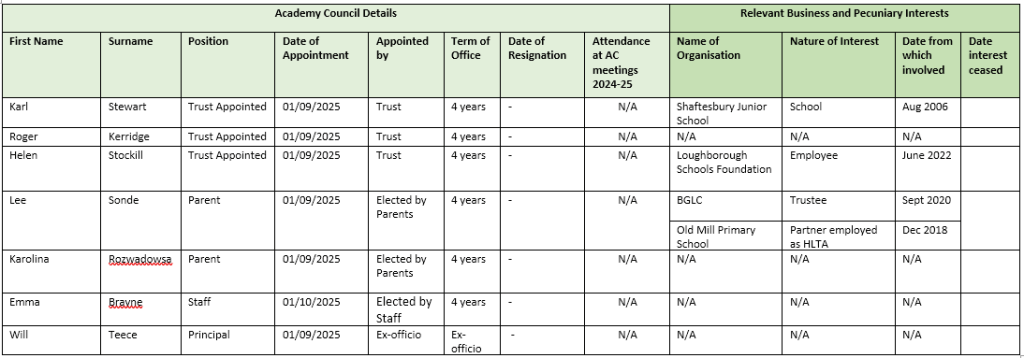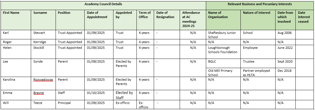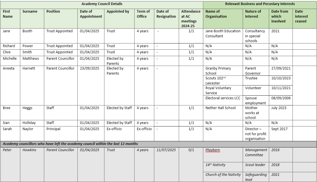 In accordance with the Academy Trust Handbook, we are required to maintain a registers of interests. Members, trustees, academy councillors, senior leadership teams and staff who have a financial responsibility must declare any personal interest that might be reasonably deemed to compromise impartiality, conflict with duty or potentially result in a conflict of interests leading to private benefit.